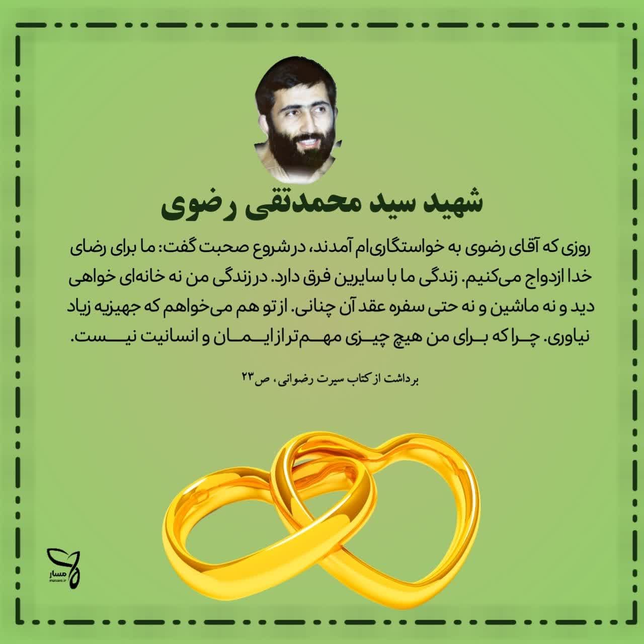 🍃روزی که آقای رضوی به خواستگاریام آمدند، در شروع صحبت گفت: «ما برای رضای خدا ازدواج میکنیم. زندگی ما با سایرین فرق دارد. در زندگی من نه خانهای خواهی دید و نه ماشین و نه حتی سفره عقد آن چنانی. از تو هم می خواهم که جهیزیه زیاد نیاوری. چرا که برای من هیچ چیزی مهم تر از ایمان و انسانیت نیست.»