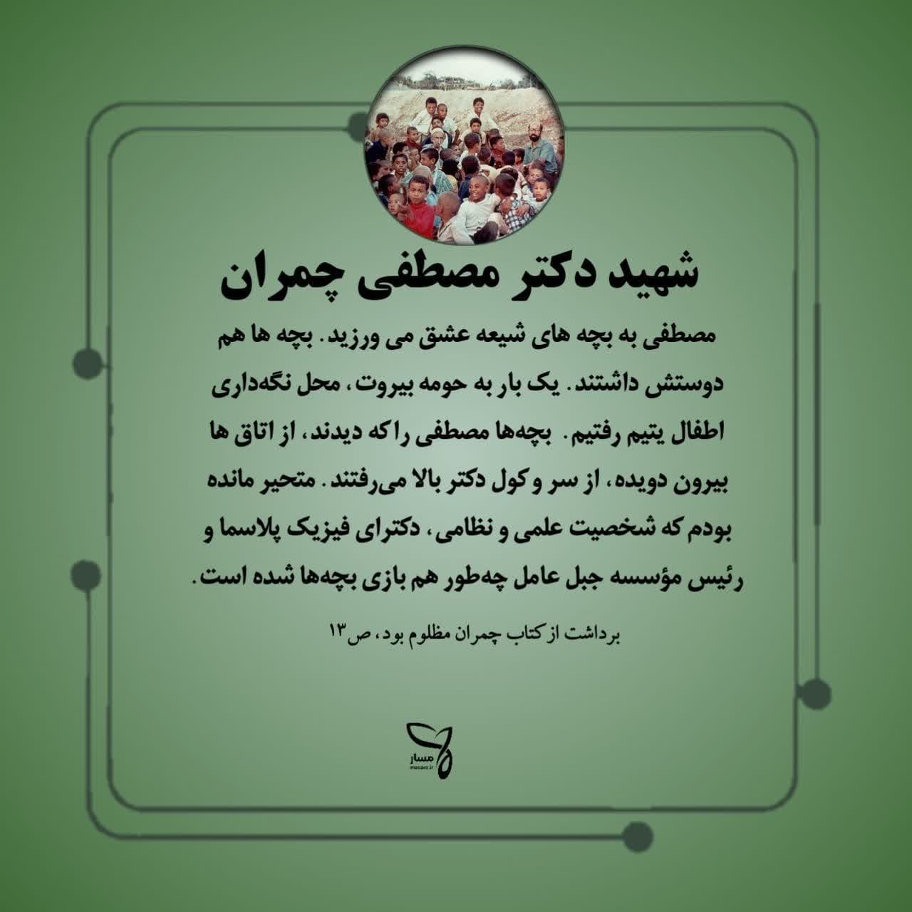 🍃 بچه ها مصطفی را که دیدند، از اتاق ها بیرون دویده، از سر و کول دکتر بالا می رفتند. متحیر مانده بودم که شخصیت علمی و نظامی، دکترای فیزیک پلاسما و رئیس مؤسسه جبل عامل چه طور هم بازی بچه ها شده است.