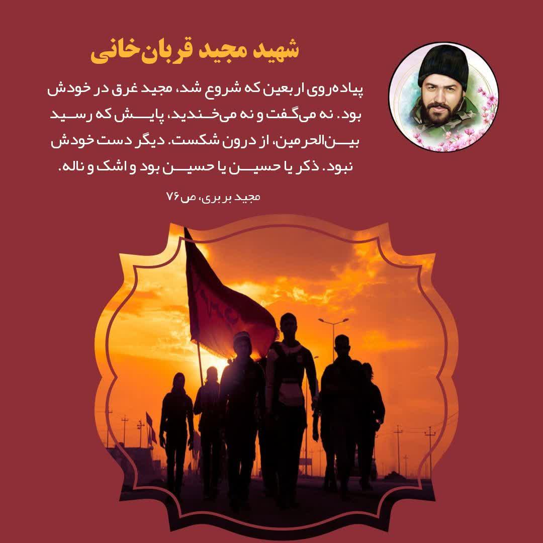 🍃هشت روز مانده بود به اربعین ۱۳۹۳ ساعت یازده شب بود که مجید سراسیمه خانه آمد. گفت: «وسایلم را جمع کن که عازم کربلا هستم.» گفتم: «زودتر می گفتی که به چند تا از فامیل و آشنا خبر می دادیم.» عجله داشت و رفقایش داخل ماشین منتظرش بودند.