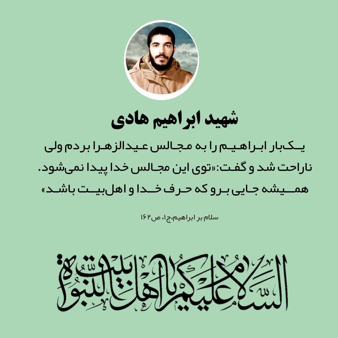 🍃میدانستم ابراهیم عاشق حضرت زهرا (س) و مجالس منتسب به ایشان است. یک شب به اصرار بردمش جلسه معروف به عید الزهرا (س) شب نهم ربیع. فکر می کردم ابراهیم از حضور در این جمع خوشحال باشد.