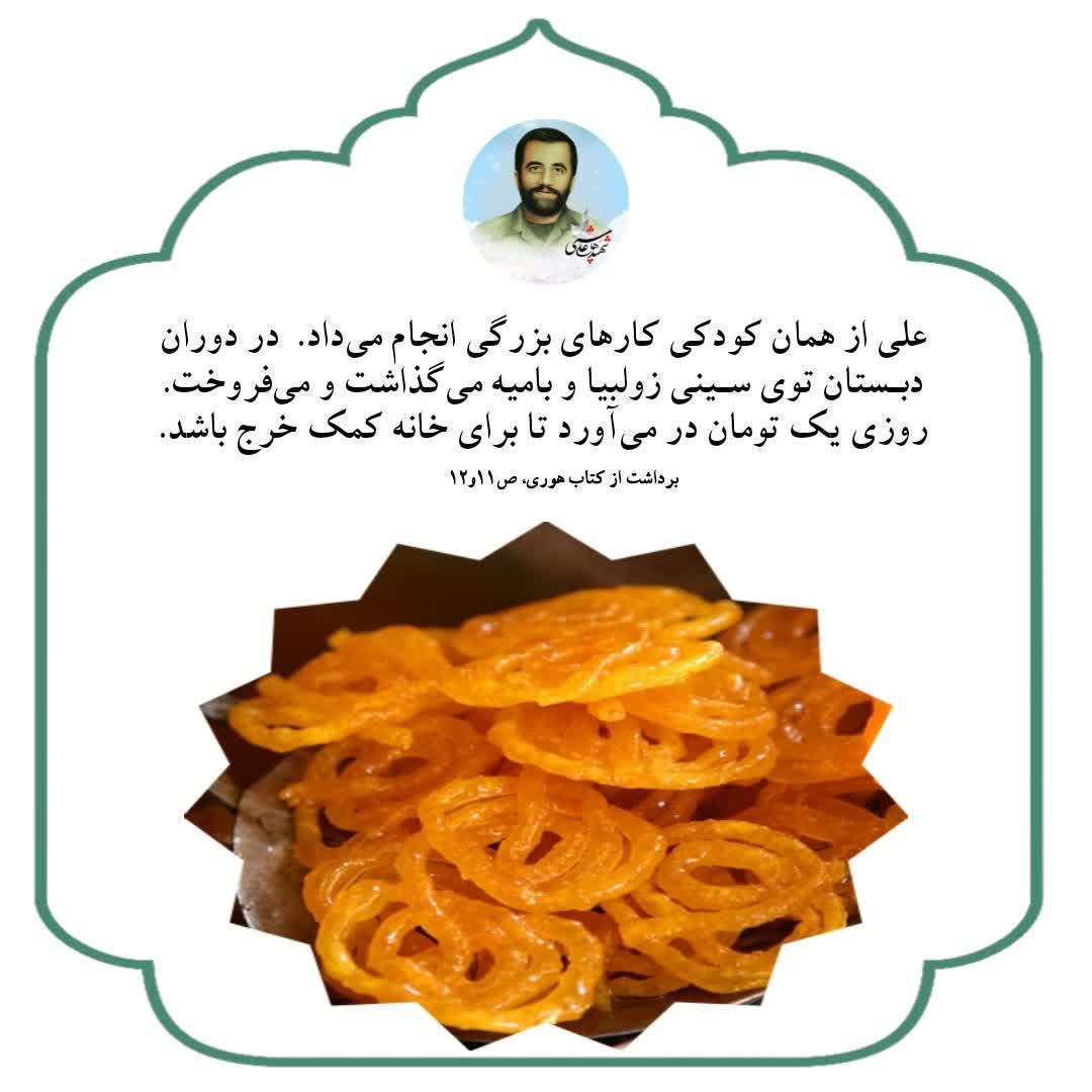 🍃علی از همان کودکی کارهای بزرگی انجام میداد. در دوران دبستان توی سینی زولبیا و بامیه میگذاشت و می فروخت؛ حتی آب خنک هم می فروخت. روزی یک تومان در میآورد تا برای خانه کمک خرج باشد.